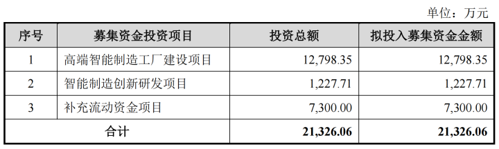 招股书显示,公司本次拟募集资金2.13亿元,其中高端智能制造工厂建设项目募资1.28亿元,智能制造创新研发项目募资1227.71万元,补充流动资金7300万元。